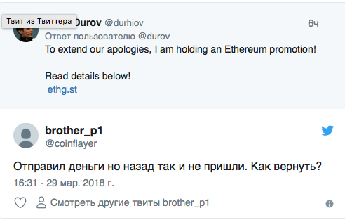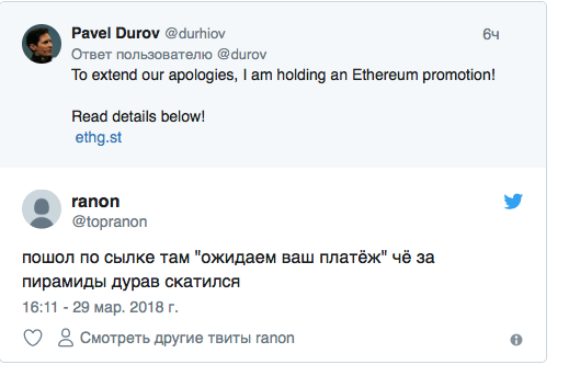 Когда многие не имели доступа к Telegram, мошенники создали страницу в Twitter, копию аккаунта Дурова и от её имени запустили розыгрыш криптовалюты, своего рода извинение за сбой перед пользователями.