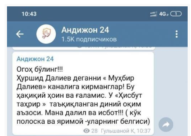 Не заходите на канал Хуршида Далиева «Журналист Далиев»! Он настоящий предатель и злодей. Он член запрещенной религиозной организации «Хизб ут-Тахрир». Вот вам доказательства и подтверждения. (Синяя полоска и полумесяц их символ), - написала Гульшана Кошкарова в телеграм-канале пресс-службы города Андижан.