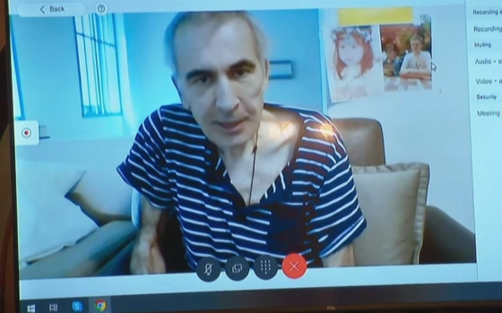 Политик подключился к заседанию впервые с февраля этого года. Сильно исхудавший Саакашвили сейчас находится в тбилисской клинике «Вивамед».
