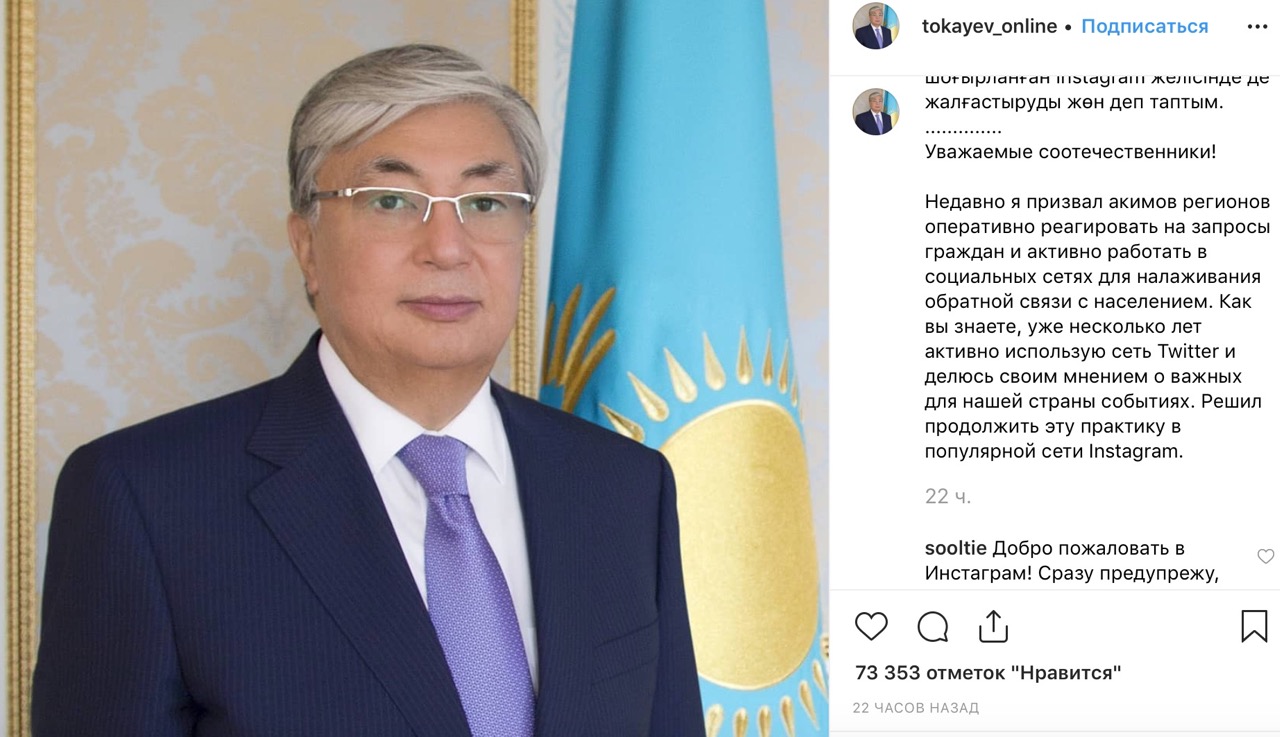 2 апреля активный пользователь Twitter Казахстана Касым-Жомарт Токаев теперь решил завести страничку в Instagram, сообщает Sputnik.kz.
