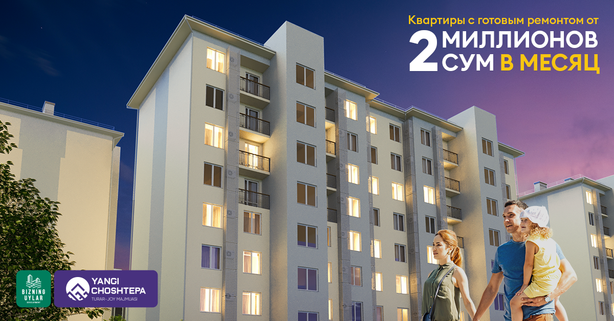 Выгодные условия ипотечного кредита увеличивают срок выплат до 20 лет, годовая процентная ставка составляет 18%. Уже сейчас вы можете оформить покупку своего будущего дома на самых привлекательных условиях. К примеру, ежемесячный платеж при приобретении однокомнатной квартиры в жилом комплексе Yangi ChoshTepa будет составлять от 2 миллионов сум. Этот вариант квартир пользуется высоким спросом среди будущих покупателей.