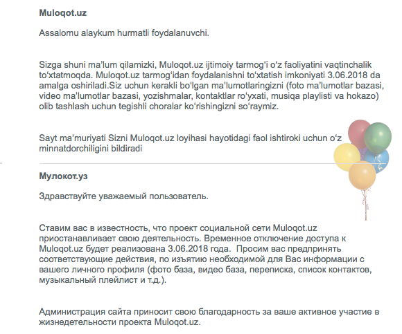 Узбекская социальная сеть Muloqot.uz объявила о своем закрытии. На официальном сайте проекта сообщается о том, что он прекратит существование с 3 июня текущего года. В связи с этим пользователей просят скачать весь нужный личный контент из профиля: фото, видео, переписку, списки контактов.