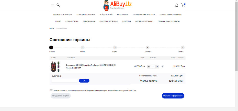 Выбираем нужный товар, добавляем его в корзину и оформляем заказ. Читатели Repost могут получить дополнительную скидку 10 % на заказ, активировав купон со словом «REPOSTUZ» при оформлении покупки. После чего останется только указать адрес и ждать доставки, которая займет от 15 до 60 дней с бесплатной доставкой по всему Узбекистану.