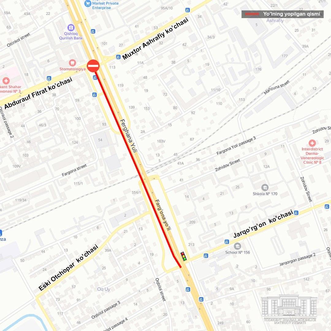 Также из-за реконструкции будет организовано одностороннее движение на мосту на участке от пересечения улицы Фаргона йули с улицей Мухтара Ашрафи до пересечения с улицей Джаркурганской.