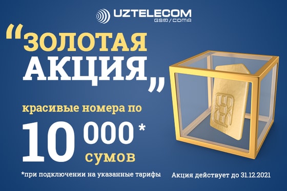 Выбирайте выгодный тариф и подключайте «красивые» номера с грандиозной выгодой. Например, при подключении на тарифы Flash, Flash Upgrade, Royal, Деловой, UNITS (11000, 14000, 18000 или 22000) или MILLIY, вы можете получить красивый номер с первоначальной стоимостью 399 999 сумов всего за 10 000 сумов.